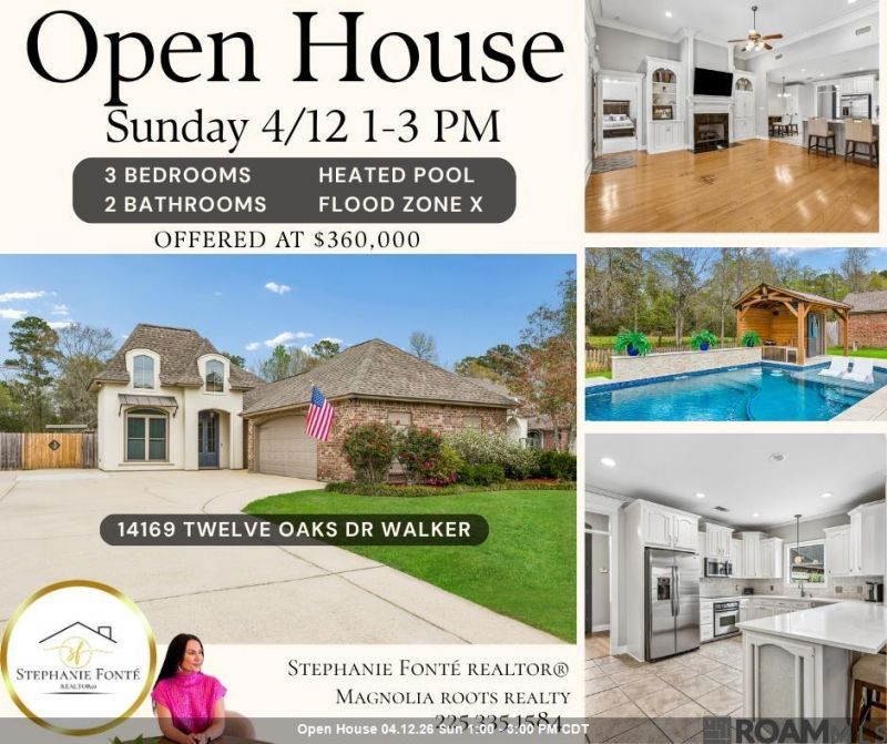 Enjoy Livingston Parish living in Flood Zone X ? seller reports the property did not flood in 2016. The outdoor setting is the standout feature of this property, complete with a heated gunite pool, tanning ledge, pool house, and covered patio, all overlooking a peaceful pasture backdrop. Whether you're starting your morning outside or hosting in the evenings, this space is designed to be enjoyed. Inside, this 3-bedroom, 2-bath home offers 1,827 living sq ft with a layout that feels both open and functional. The main living area is filled with natural light and flows easily into the dining space and kitchen, creating a comfortable setting for everyday living. The primary suite is tucked away for privacy and features backyard views, a jetted tub, separate shower, double vanity, and a walk-in closet with direct access to the laundry room for added convenience. Additional bedrooms are positioned on the opposite side of the home with access to a full bath. Located in Twelve Oaks Subdivision with convenient access to I-12 and nearby shopping and dining at Juban Crossing.